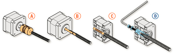 將電機(jī)固定到梯形絲杠上通常需要耦合器總成 (A)、沉孔壓配合 (B) 或空心軸壓配合 (C)。 組裝流程可能還需要使用 粘合劑或焊接,但結(jié)果就是所有這些解決方案將造成難以或無法更換梯形絲杠 或進(jìn)行維護(hù)。 通過正在申請專利并只需要一個(gè)固位緊固件的錐形鎖套耦合器 (D),Thomson 已成功解決這一問題。 您可利用這項(xiàng)全新設(shè)計(jì)輕松進(jìn)行維護(hù)或梯形絲杠的更換。