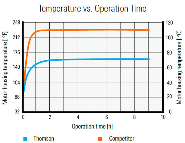 由于 Thomson 的電機(jī)效率更高,因此可在更低熱損耗的條件下輸出更多扭矩,這意味著我們的電機(jī)可在更高的輸入功率下運(yùn)行,同時(shí)減少熱量產(chǎn)生。