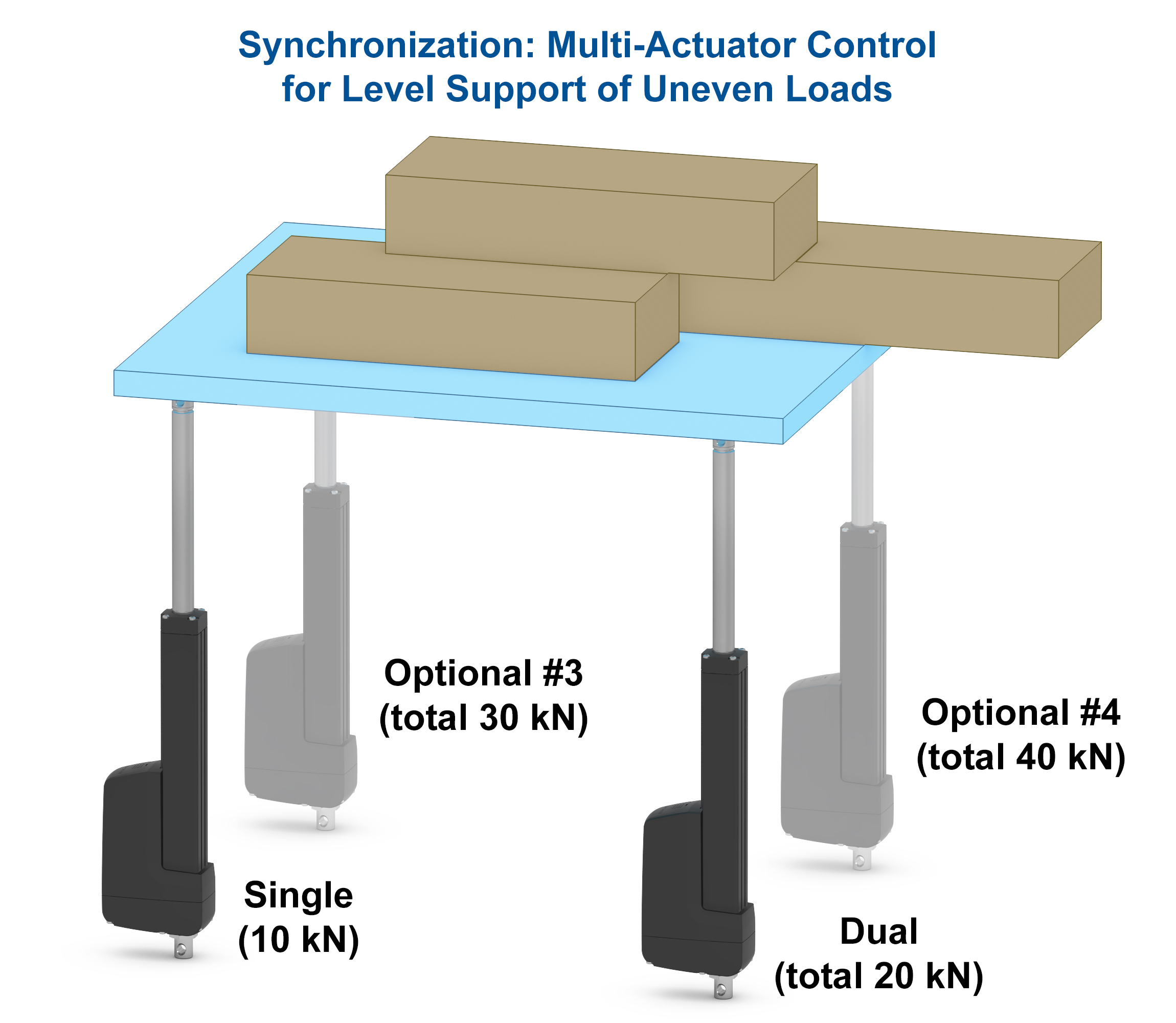 Synchronization enables motion integration of up to four Electrak HD actuators. When multiple units with the synchronization option are installed, designers can take advantage of a more stable and potentially quicker lift, no additional guides, and improved handling of uneven loads.