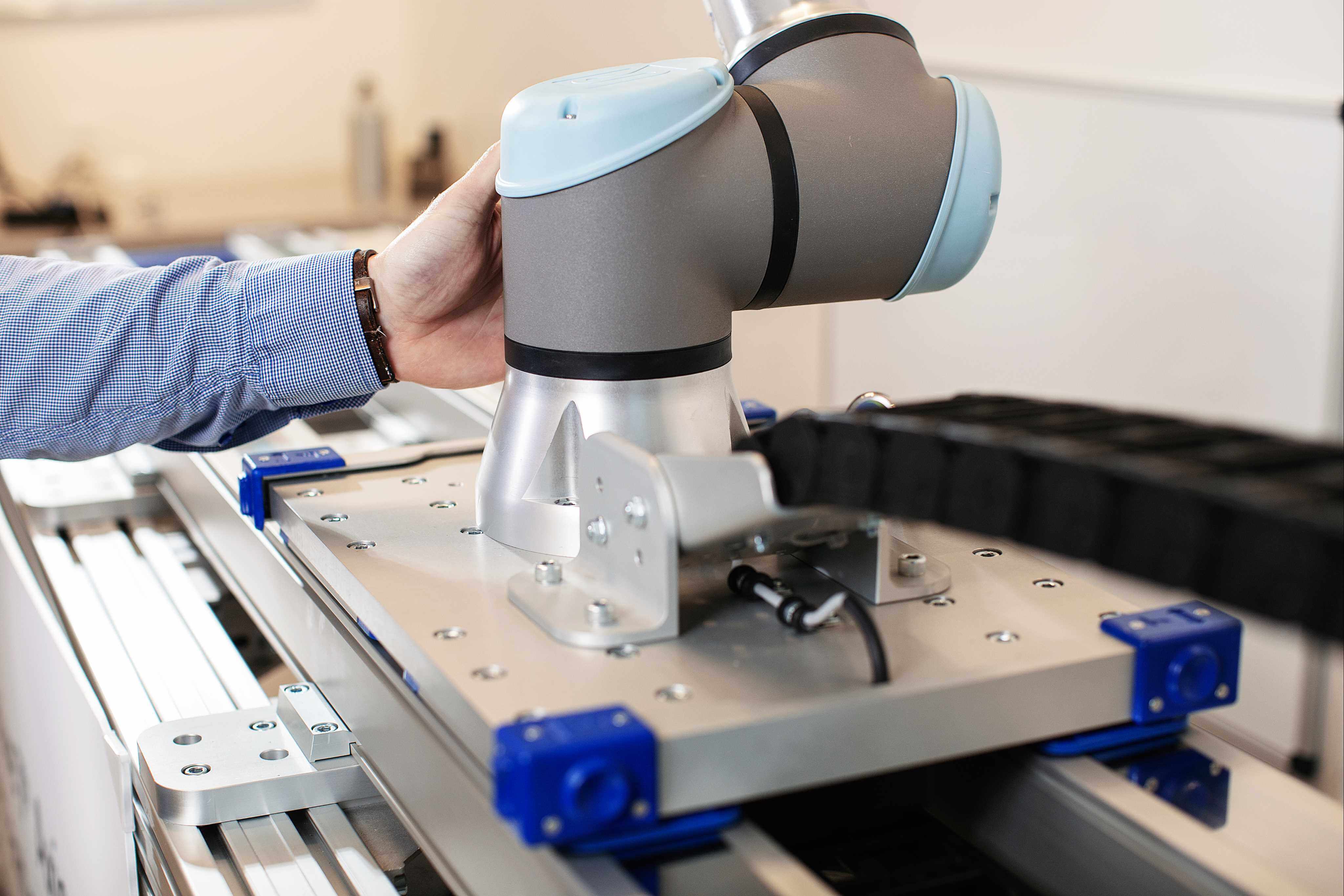 • Movotrak 7th axis can be mounted with any UR robot, including the UR20, in all directions (horizontally, wall-mounted, inverted, etc.).