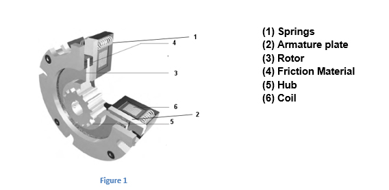 In spring set architectures (Figure 1), compression springs (1) apply the braking force. When the power is off, the force from the springs pushes the non-rotating armature plate (2) into a rotor (3). The rotor hub fits a splined or hex-shape shaft, connecting the load. In power-off mode, springs hold the rotor keeping its connected clamped load. The advanced friction material (4) on the rotor maintains its torque.