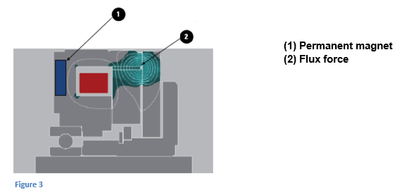 In normal power-off mode, the permanent magnet in the assembly (1) creates an attractive force on the armature assembly (2), which is attached to the load shaft by means of screws or pins, hence stopping or holding the load.