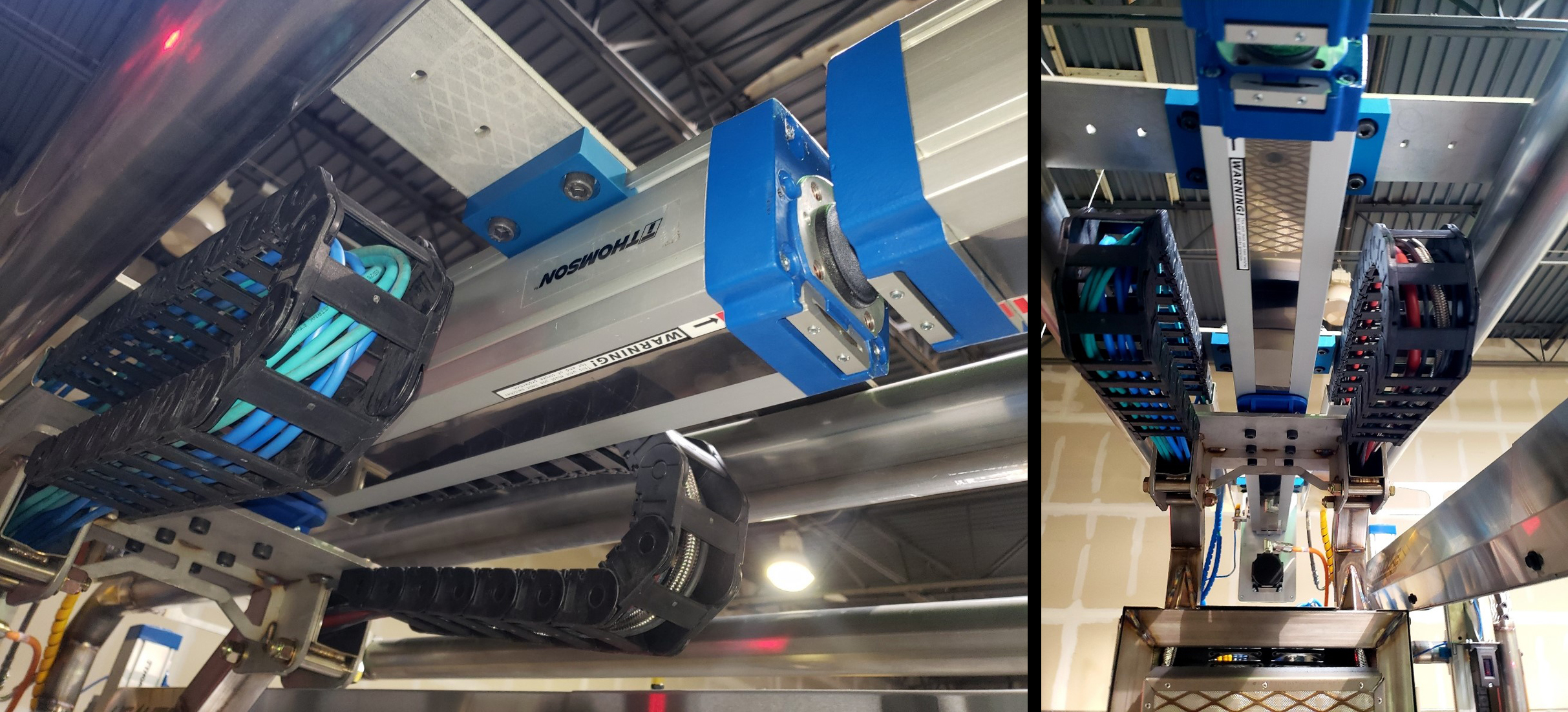 兩個(gè)垂直安裝的Thomson M100直線運(yùn)動(dòng)系統(tǒng)隨著固化系統(tǒng)前后移動(dòng),并上下移動(dòng)裝有頂置加熱器的吊桿。兩個(gè)Thomson MG07直線模組水平安裝,以引導(dǎo)百葉窗運(yùn)動(dòng),使紅外燈傾斜以實(shí)現(xiàn)最大覆蓋范圍,并避開(kāi)后視鏡等突出部件。還有兩個(gè)額外的Thomson M100直線模組垂直安裝,以控制攝像機(jī)的上下運(yùn)動(dòng),監(jiān)測(cè)車輛尺寸并將定位數(shù)據(jù)發(fā)送到運(yùn)動(dòng)控制組件。