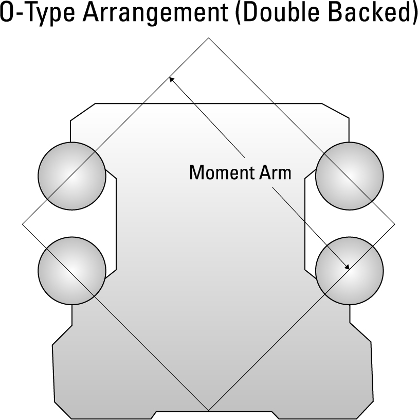 Figure 2. The O-type arrangement features double-backed profile rail further from the center of rotation for a higher resistance to moment loads. This configuration, however, cannot tolerate misalignment or surface imperfection.