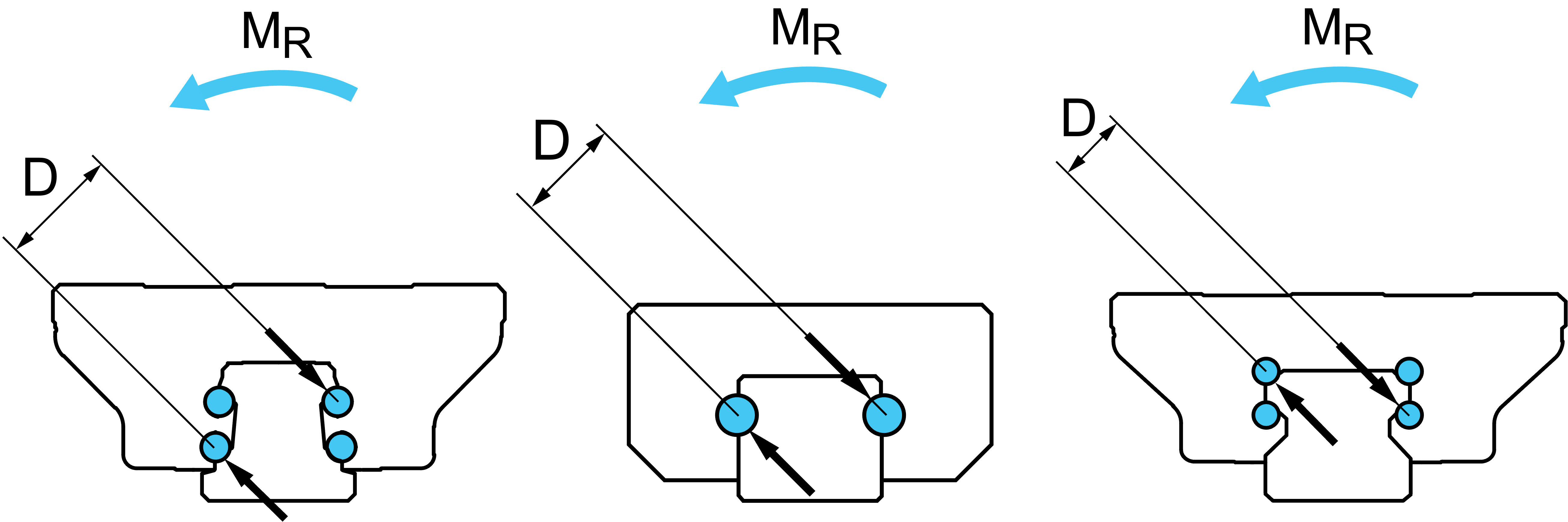 • Gothic arch architecture arranges two larger ball bearing tracks (each with four contact points) to allow smaller rail sizes while minimizing the negative impact on rigidity and allowing for an intermediate moment arm “D.”